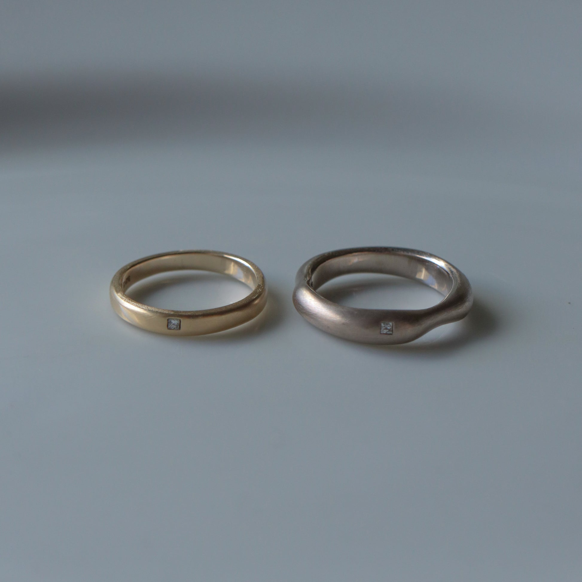 スクエアフォルムのダイヤモンド/ルビー/サファイアを、表面や裏面・端や中央などリングの好きな場所に埋め込むことが可能です。