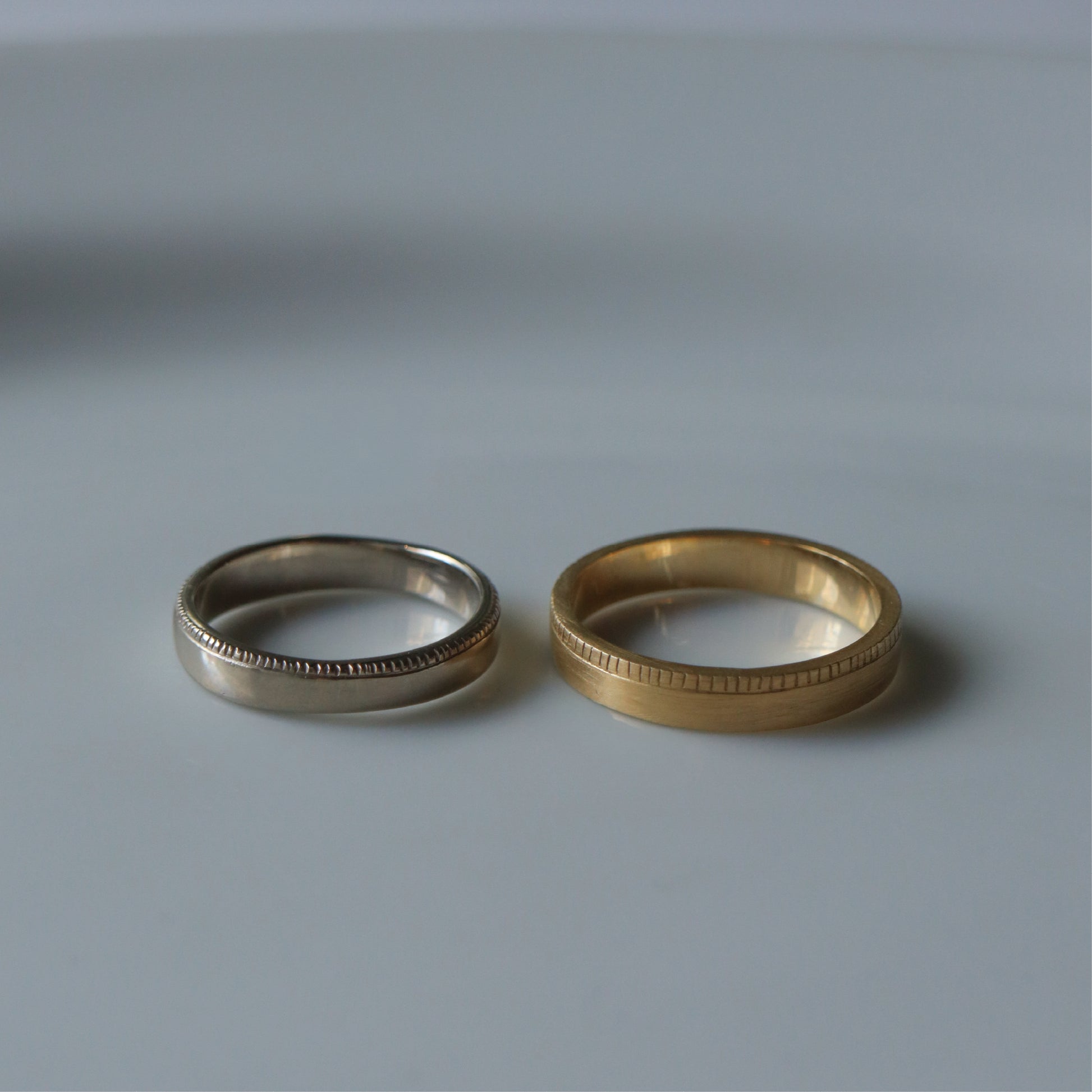 縁に施された繊細なラインが指元を静かに引き締める仕上げとなり、一つ一つ丁寧な手作業で施しています。